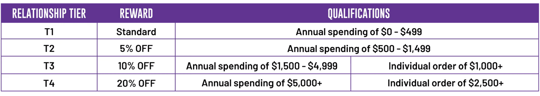 Yes. Our Partner Program includes tiered discounts based on annual spend or qualifying single orders: T1: Standard pricing ($0–$499 annual) T2: 5% OFF ($500–$1,499 annual) T3: 10% OFF ($1,500–$4,999 annual or $1,000+ single order) T4: 20% OFF ($5,000+ annual or $2,500+ single order) Tier status carries through the calendar year. Discounts apply to custom-label products and can’t be combined with other promos.